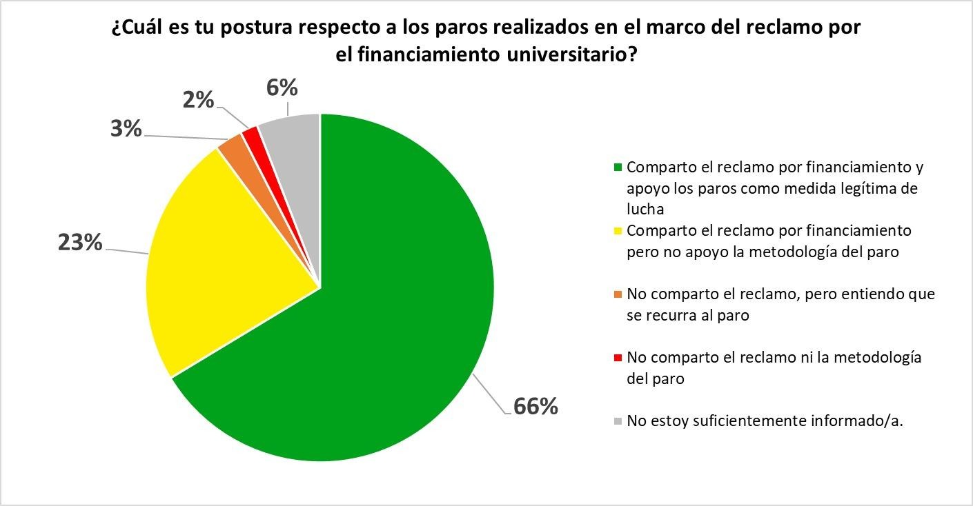 La tercera y última de las preguntas es muy llamativa, tanto por la contundencia de las alternativas de respuestas, como por la más elegida de ellas. El 76% declara que el reclamo es legítimo, y no está vinculado solo a salarios, sino a la calidad de la educación y al futuro (dos elementos de sumo interés individual para lxs estudiantes).