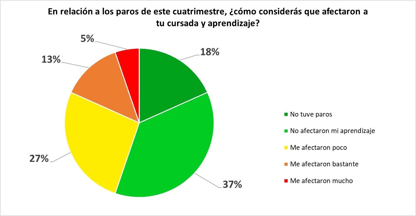 Resulta interesante el análisis de la relación entre la realización de paros y la afectación de la cursada y el aprendizaje. Apenas 5% consideró que afectó mucho y 13% califica de bastante.
