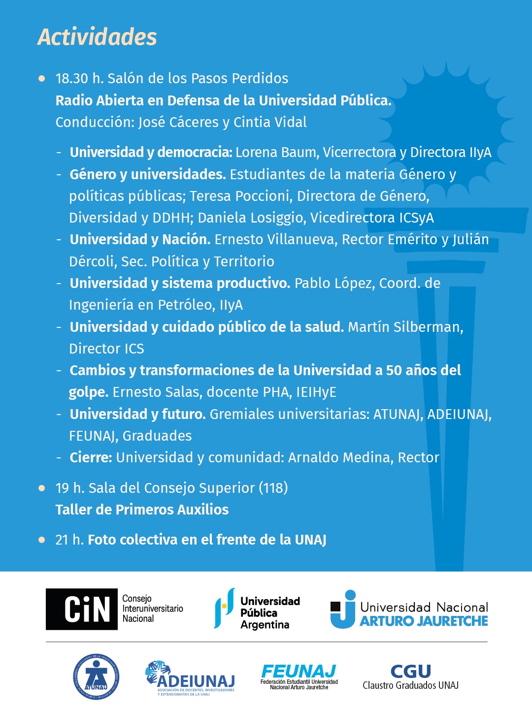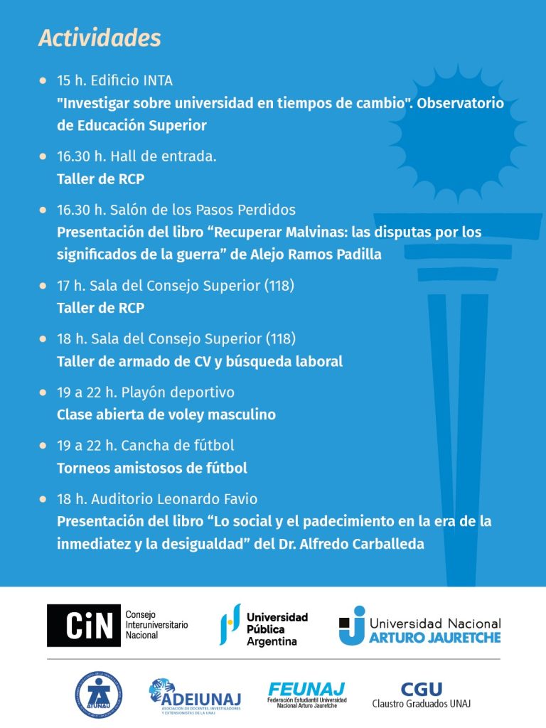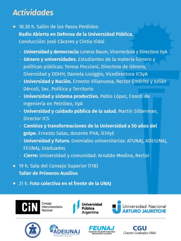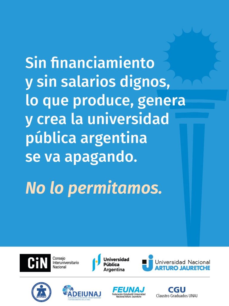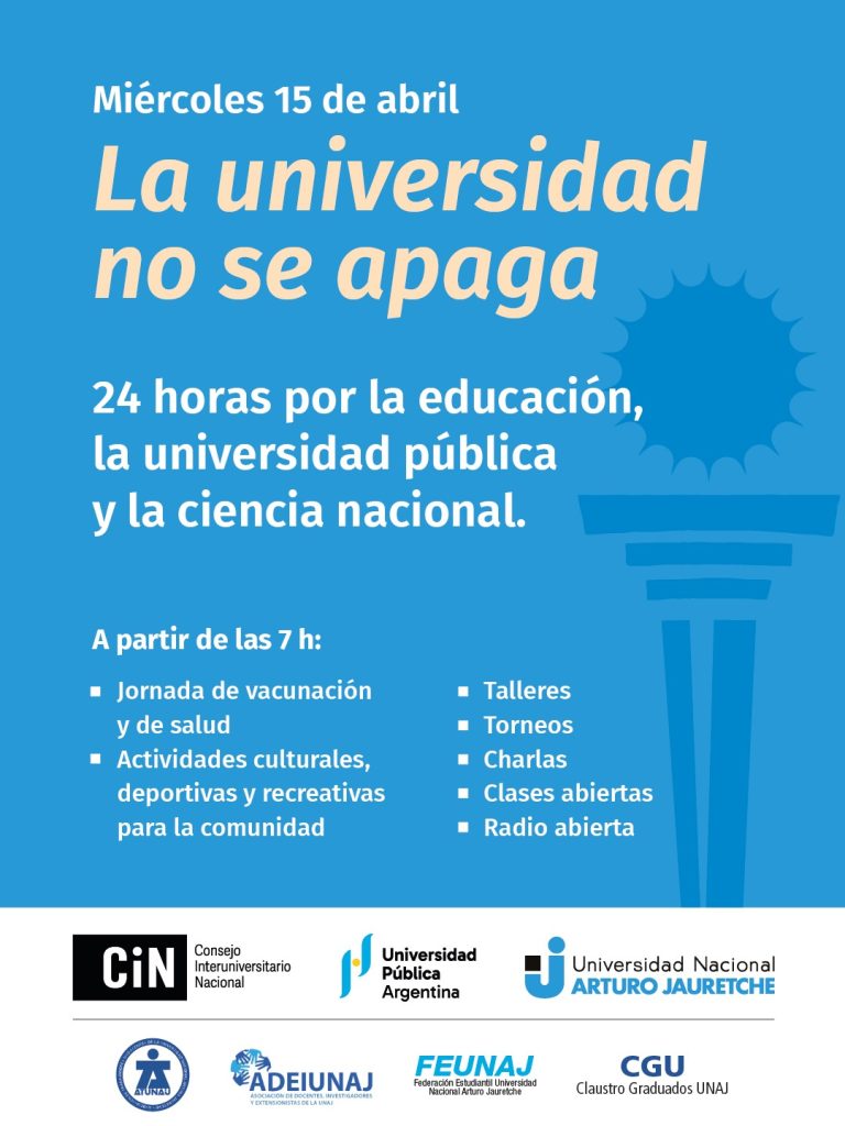 Durate el miércoles 15 de abril la comunidad universitaria de la UNAJ en su totalidad participará de la jornada nacional “La universidad no se apaga” con 24 horas de actividades por la educación, la universidad pública y la ciencia nacional.