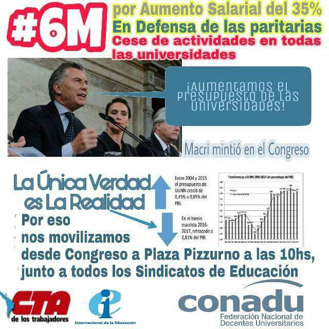 Compañeras/os, convocamos a movilizarnos este lunes 6 de Marzo en el Congreso de la Nación a las 10 hrs para marchar al Ministerio de Educación. junto con todos los sindicatos de la educación en defensa de la paritaria. Adherimos al cese de actividades para movilizar en las Universidades decidido en la última reunión de Secretarios Generales de CONADU.